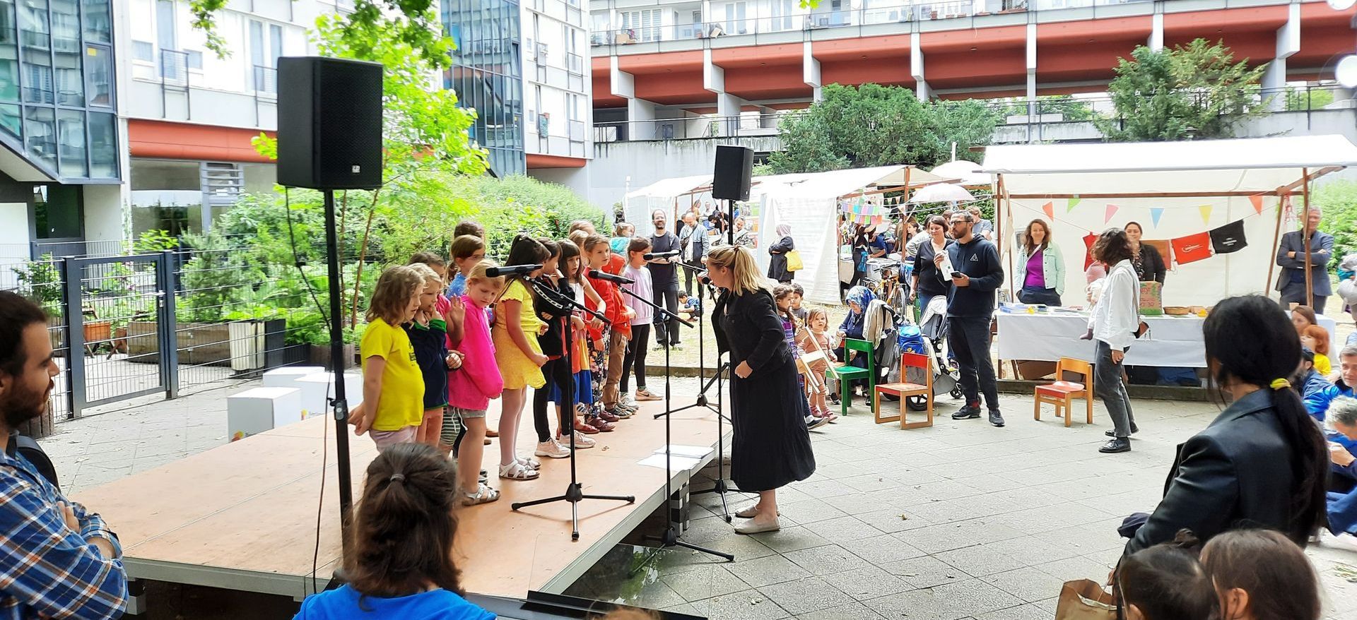 The youngest members of the children's choir made their debut performance at the neighborhood festival in the courtyard of Moabit Stadtschloss, led by Christiane Hiemsch. Level 1, with Judith Kamphues and accompanied by Lidia Kalendareva on piano, gave a first taste of the songs that will be performed at the sing-along concert on June 20th at the Philharmonie.